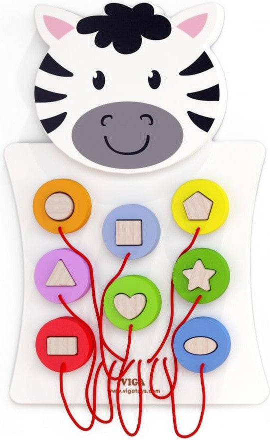 Set of 3 wooden wall activity panels to engage children in cross-curricular learning. Panels are styled as a brown horse, with wire beads and gears, a yellow giraffe with fruit puzzle blocks to mix and match, and a black and white zebra with colourful shapes to identify and match.