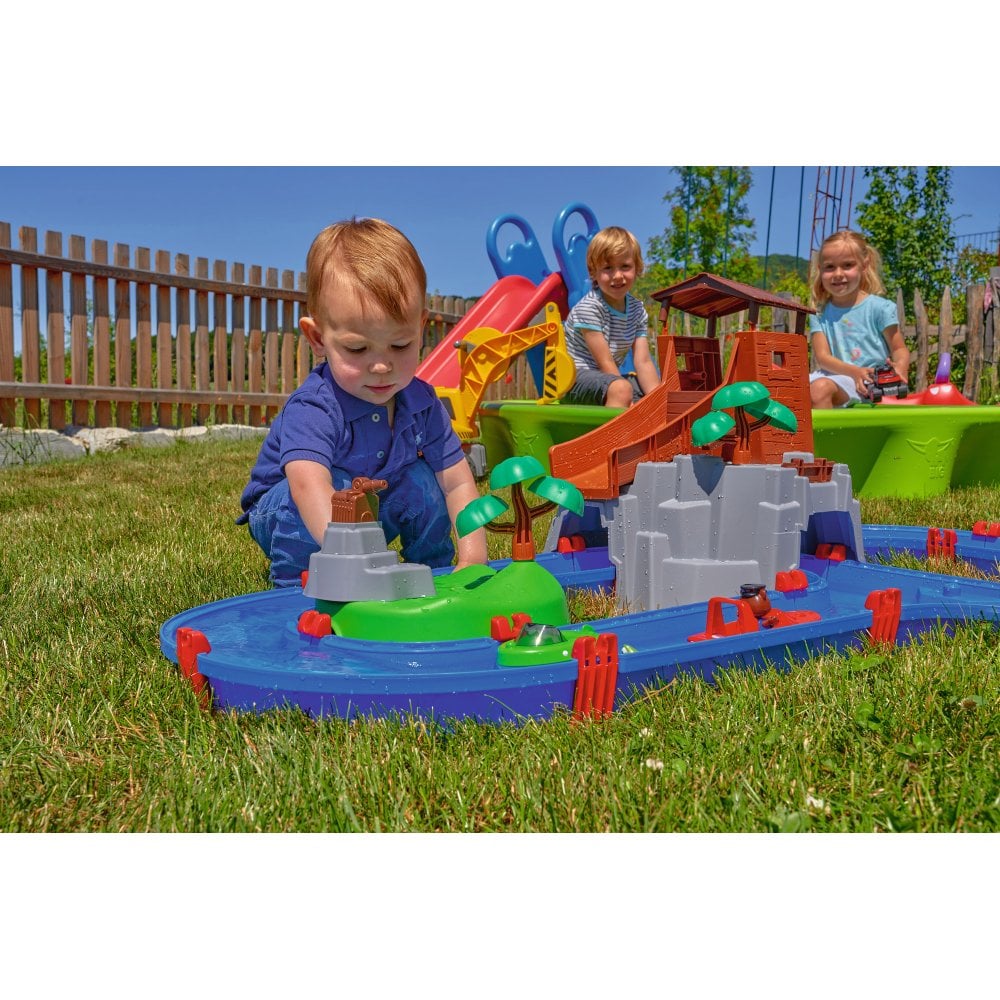 With the AquaPlay AdventureLand waterway, a real adventure feeling comes into your home garden. The large play set contains, among other things, a large mountain with tower and reservoir and two boats with animal figures, the frog "Nils" and the bear "Bo". Together with the two friends, the children can cross caves and waterfalls, ride down the wild water slide, fill and drain the mountain lake and hide and search for valuable treasures. In the game, children get to know the element of water and see how currents develop and their direction can be changed. In the grassy hill, where there is also a cave with two entrances, there is also a secret hiding place under movable stones, in which the little treasures of the children are well kept.