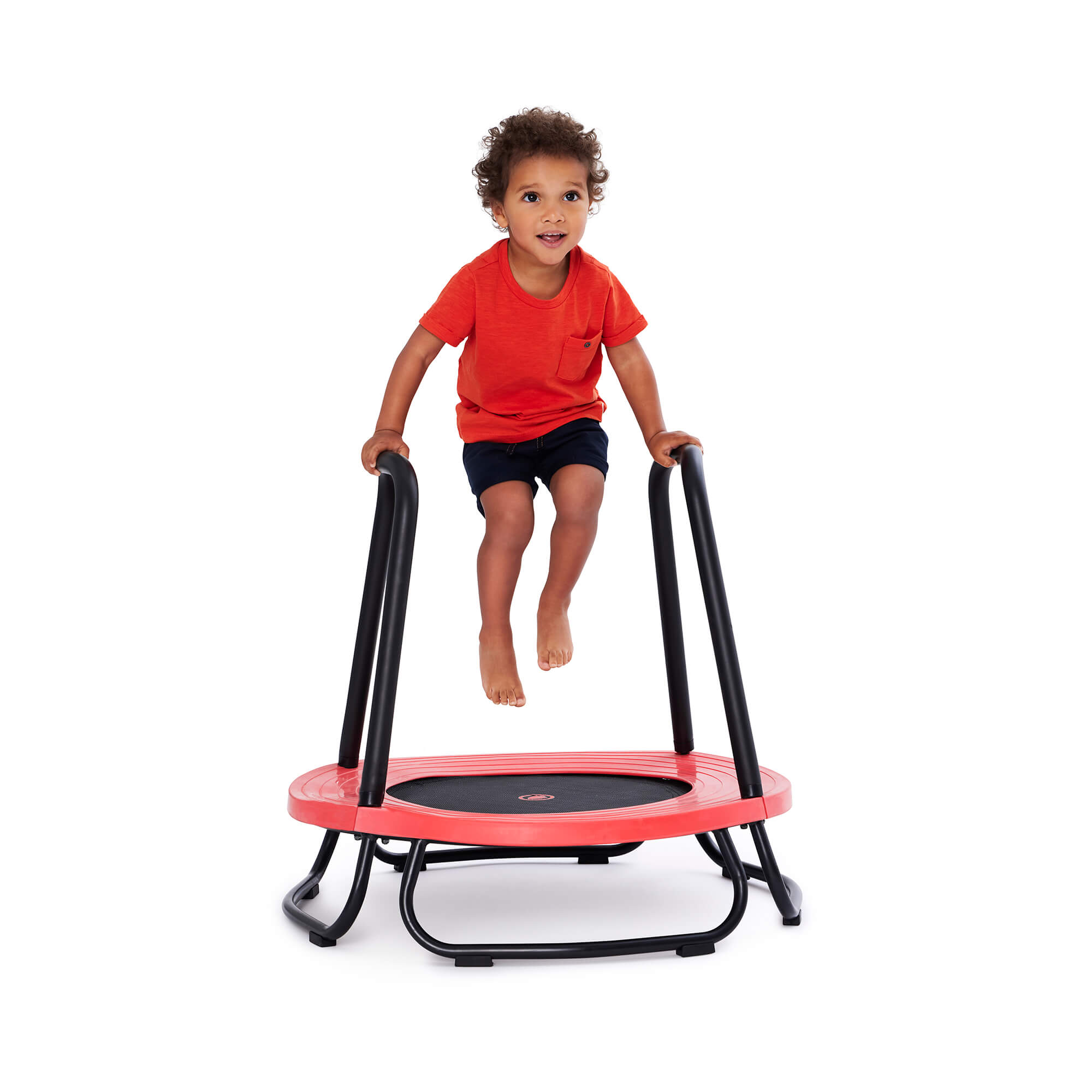 From aiding vision and auditory motor skills to offering a cardio workout that strengthens and lengthens muscles, this trampoline provides endless developmental benefits. Its thoughtful design ensures maximum safety with foam-covered handles, a low spring sheet height, and a durable rubber cover to protect against bumps.
