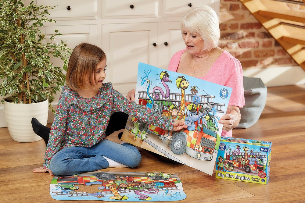 Join the jolly animals on board the Big Fire Engine as you complete this fun, 20-piece jigsaw! This 20-piece fire engine scene features a fun and quirky firefighting crew, with lots to see and talkabout! Includes a bright and colourful poster of the jigsaw plus, a learning guide to promote discussion such as finding the green hose, counting the helmets and asking why do we need fire engines?