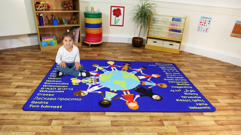 Cultural Diversity: Continue the theme of children around the world with this unique carpet, fostering an inclusive and welcoming atmosphere. The vibrant designs and multilingual "welcome" message provide an excellent way to introduce cultural diversity to students.
