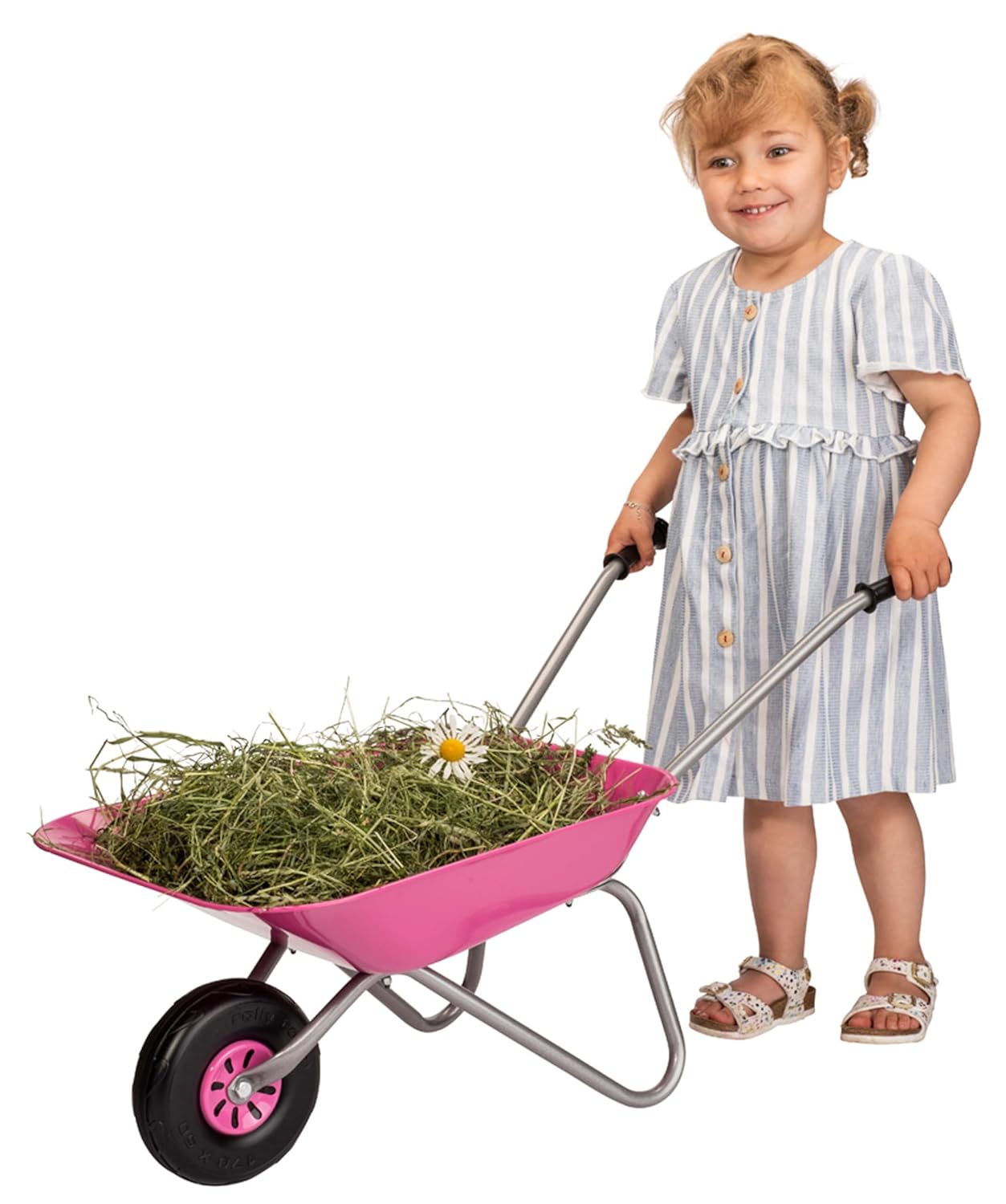 Available in vibrant pink, green, or blue, it features a strong metal bucket and frame, making it both charming and tough enough for everyday play. The rubber handgrips are designed for small hands, offering a secure and comfortable hold as children push, tip, and explore. With a generous load capacity of up to 25 kg, it’s perfect for imaginative play and developing motor skills.
