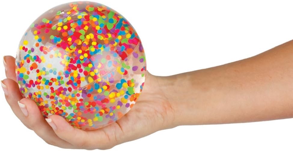 A large and jolly bouncy ball filled with multi-coloured beads suspended in clear liquid. When bounced or rolled from hand to hand, the beads eddy and swirl within the moving liquid to create enchanting torrents of colour. The kind of toy that just begs to be picked up and played with!