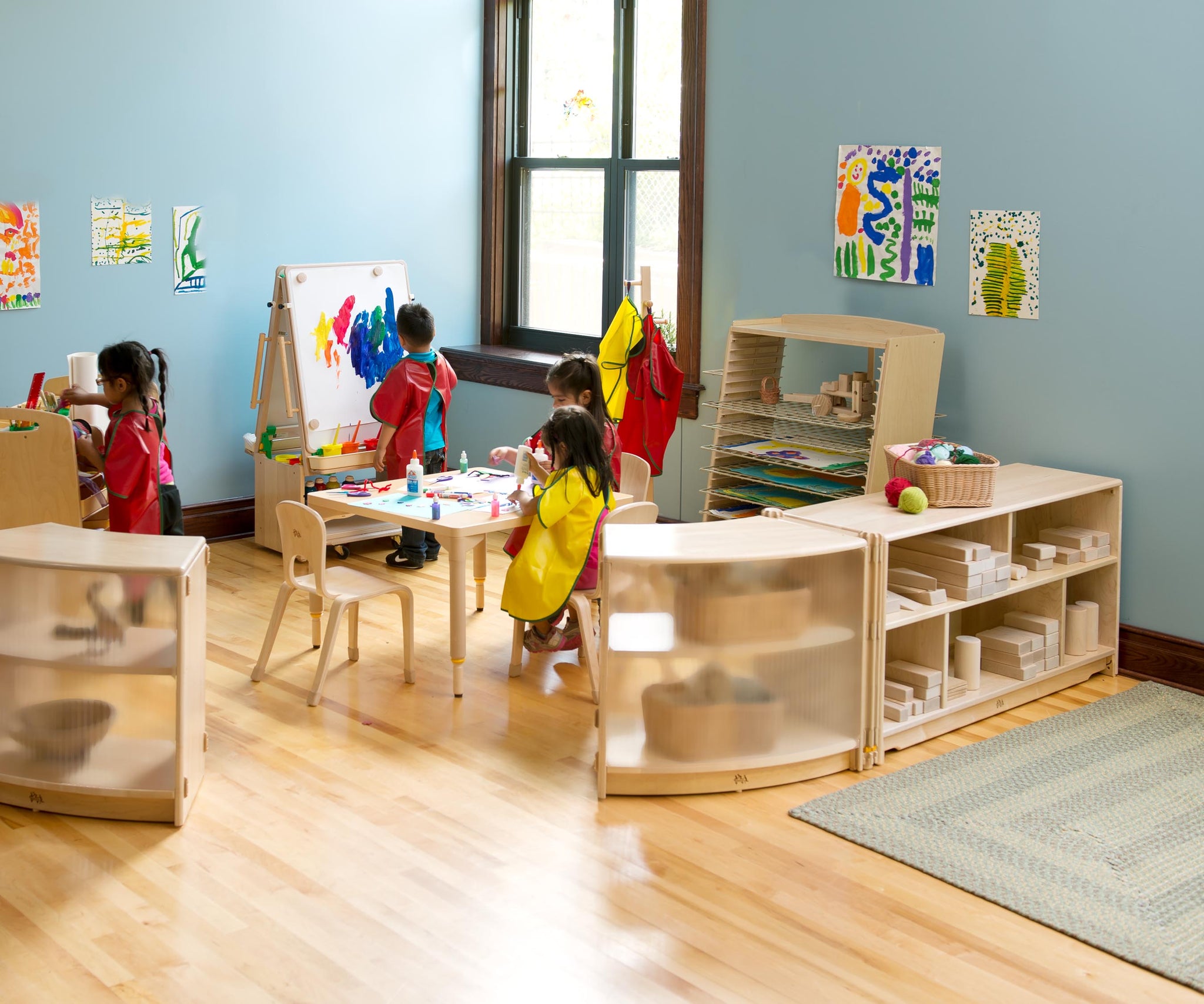 Books, blocks, and much more fit on this sturdy shelving unit. The translucent back lets light in and aids supervision. Use Roomscapes shelves, panels, and gates to create modular room dividers.