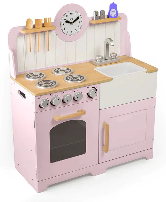 This country style kitchen is designed with a taller work surface for years worth of play. It also features an oven and hob with clicking dials, storage cupboards, Belfast sink, clock and utensil shelves. It also includes three kitchen utensils, plastic bowl in sink, salt and pepper shakers and washing up liquid for extra play value.