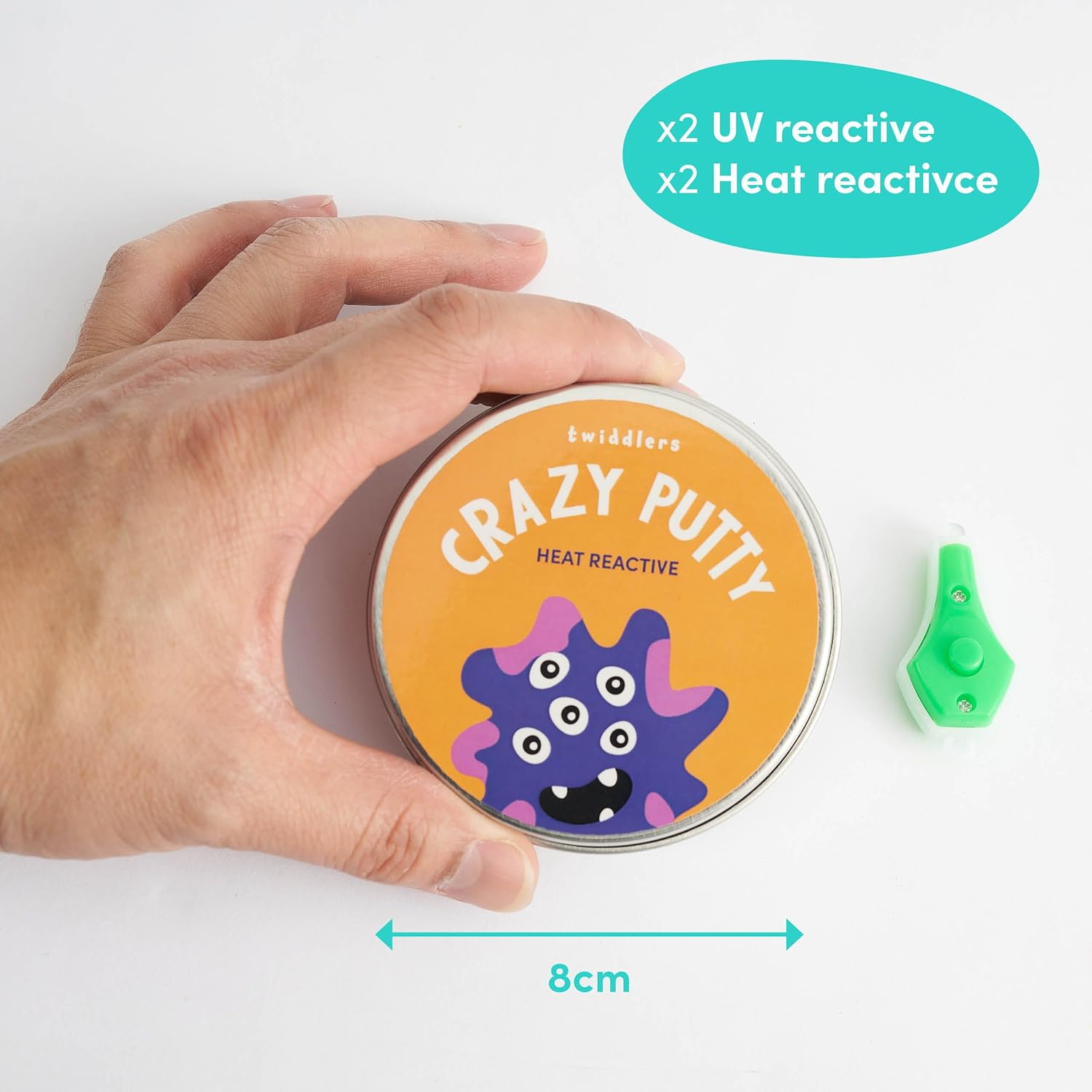 Stretch, squish, and watch the magic unfold!Step into a world of mesmerising transformations with our Crazy Colour Changing Putty. This exciting 4-pack includes two heat-reactive and two UV-reactive putties, each offering a unique sensory experience that changes colour before your eyes. Whether you're twisting, bouncing, or sculpting, every touch brings a new surprise.