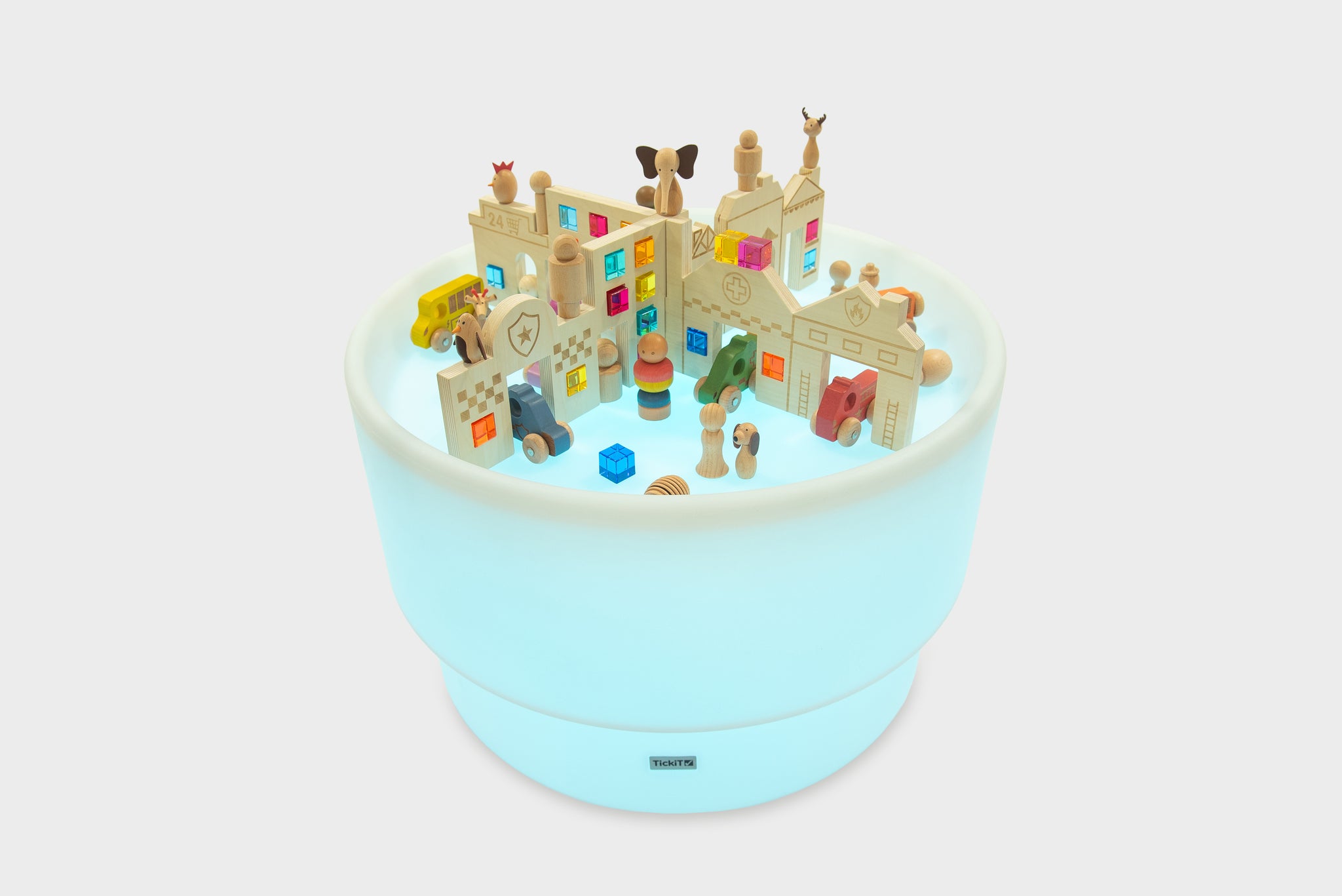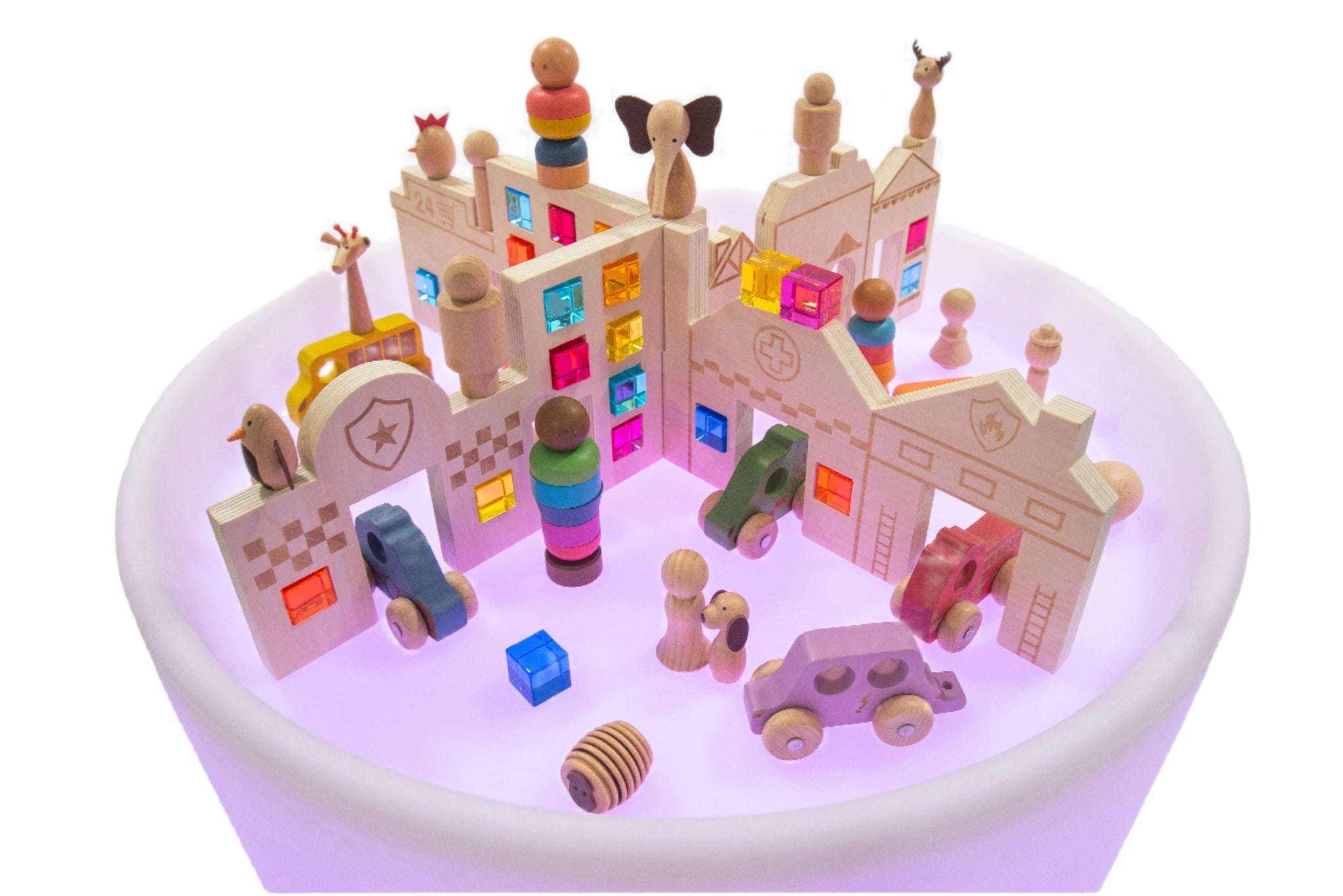 Designed for sensory spaces, schools, homes, and early learning environments, this set inspires creativity, develops fine motor skills, and encourages descriptive storytelling. The raised edge of the table keeps everything contained, while the illuminated play surface transforms the scene with different colours, bringing a magical new dimension to the town. With mix-and-match rainbow people, translucent gem cubes for windows, and friendly wooden figures, this playset is packed with opportunities for role-play, social learning, and sensory discovery.
