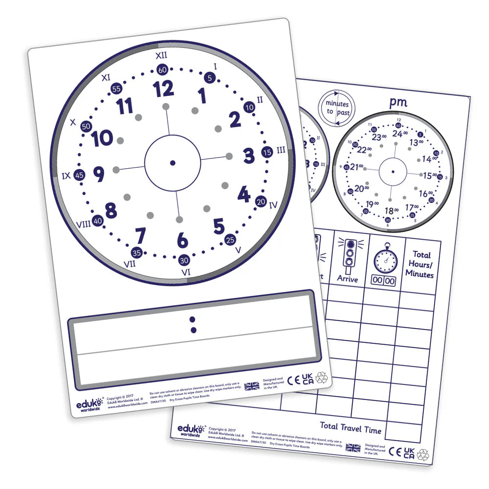 Side one displays hours, minutes, seconds, and Roman numerals, alongside a handy panel for practising analogue and digital times. Flip it over and side two reveals two dials – one showing am/pm with a 12-hour clock and another showing the 24-hour clock, complete with minute and second markings. There's even a time table grid filled with different modes of travel to make real-world timing activities even more exciting! Made from durable, recyclable plastic, this wipe-clean board is perfect for everyday classroom use and endless time-telling adventures.
