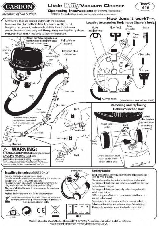 • Included Items: Toy Hetty vacuum cleaner, removable debris drawer, nozzle accessories