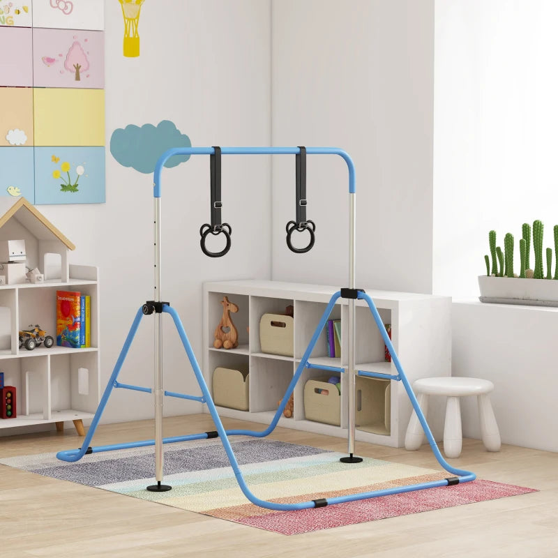 Adjustable Height, Foldable Kids Gymnastics Bar with Rings – For Ages 3+