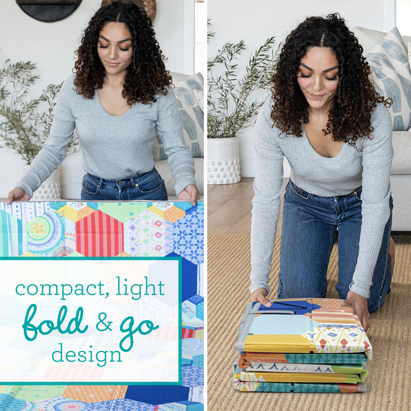Your baby will love this soft yet grippy foam mat, perfect for learning new skills like rolling, crawling, and sitting. The unique pop-up sides keep roll-away toys from escaping, and the double-sided boho-inspired print keeps it visually fun for baby and considerate for parents. The compact, light fold & go design makes it easy to store away, move from room to room, or take on the go.