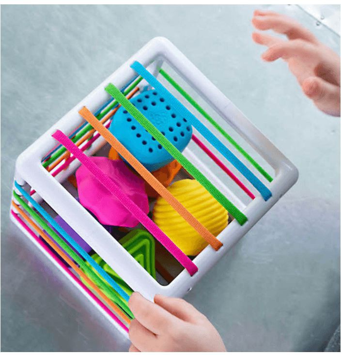 But the best part? As kids push the shapes through the elastic bands of the cube, curiosity is sparked and young minds can't help but explore, experiment, and discover.