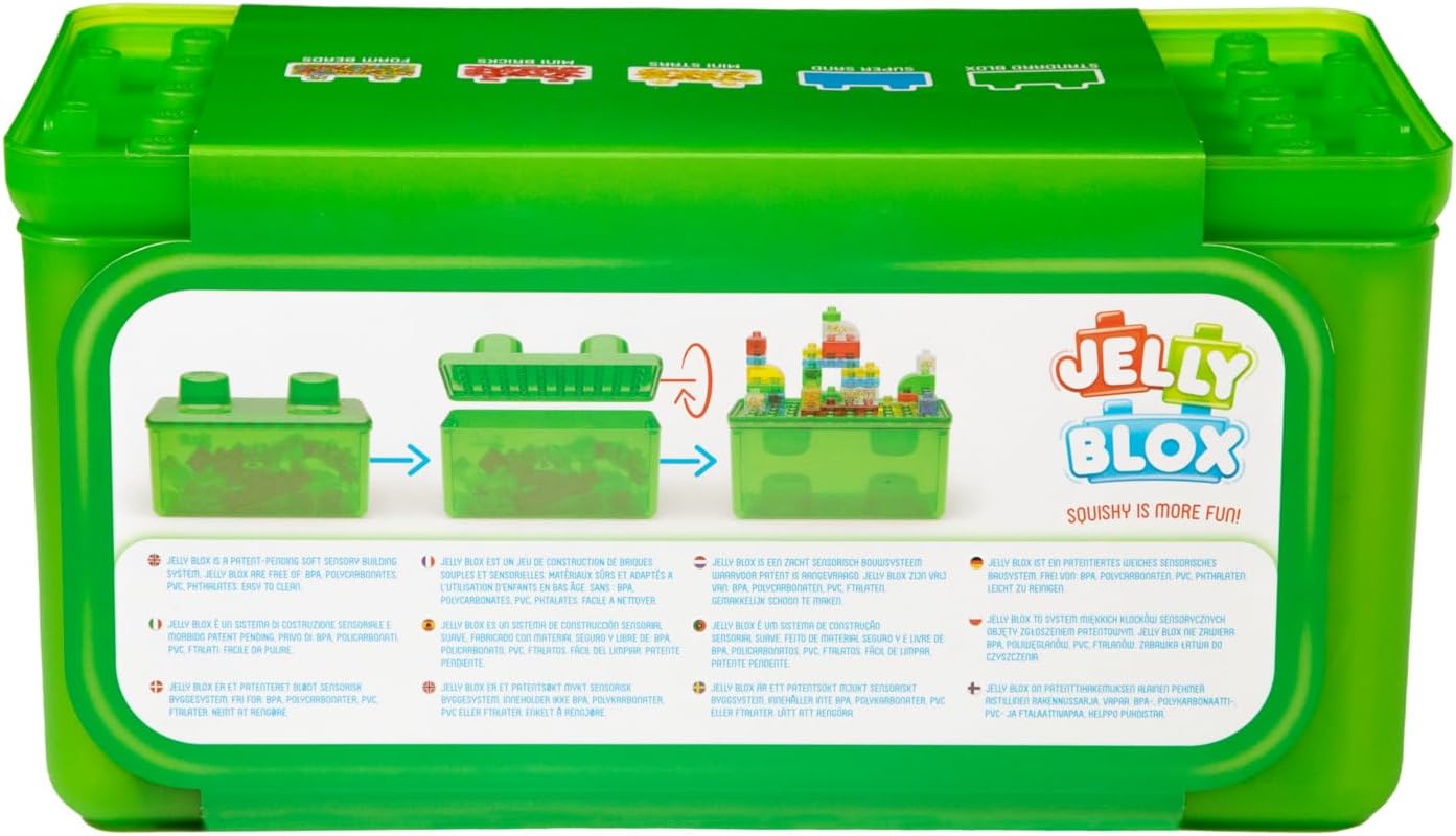 Includes 30 Jelly Blox: A mix of soft, squishy blocks—some with fun fillings like sand, mini stars, foam balls and bricks for sensory delight.