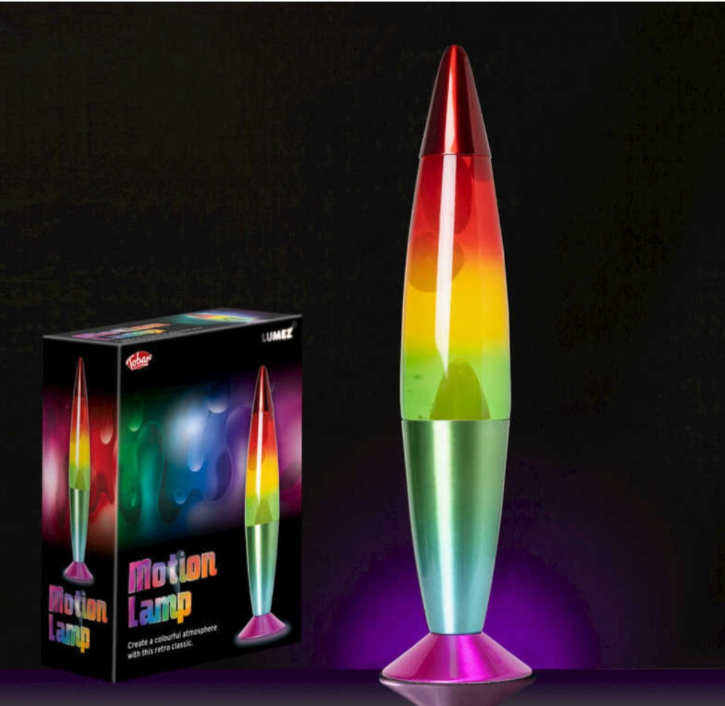 Rainbow-hued lamp w/ mesmerizing swirls of wax inside liquid. Plug in the motion lamp and let the bulb heat the fluid, swirling 'round the cylinder. The white wax blobs mix, meld and stretch, creating an entrancing & groovy presence. This nostalgic lamp is a delightful yet captivating piece of decor for any room. Colourful motion lamp w/ white wax Wax blobs swirl & flow around Rainbow hued design