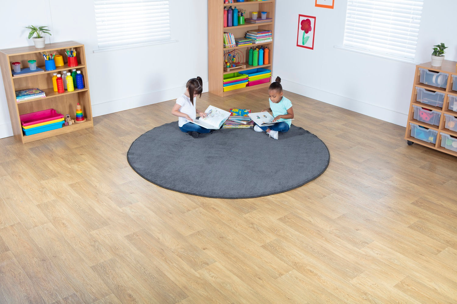 Create serene reading environments with our super soft round carpets. Ideal for libraries and quiet zones, available in calming Grey and Blue tones.