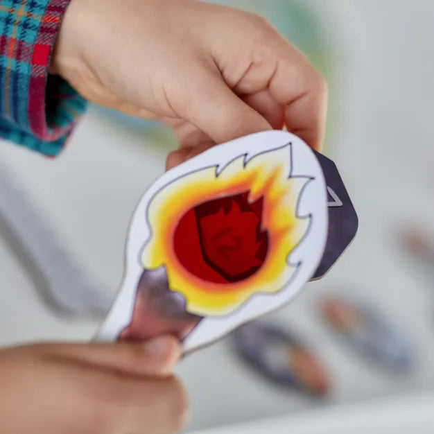 If they land on a plus or minus square, they solve one of their four addition and subtraction sums and check their answers using the magic viewer. If correct, they hook the completed sum over the 3D mammoth's trunk!
