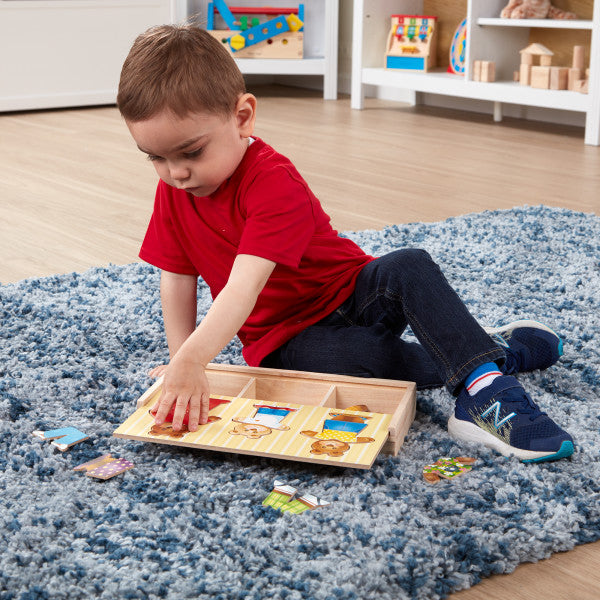 This Mix 'n Match Wooden Bear Family Dress-Up Puzzle With Storage Case set contains 45 mix-and-match pieces to assemble Mama, Papa and Baby Bear. It's fun to change their expressions and their clothing to express their every mood. The wooden box has compartments for easy storage and the box lid conveniently serves as a puzzle board. Great for story telling fun!