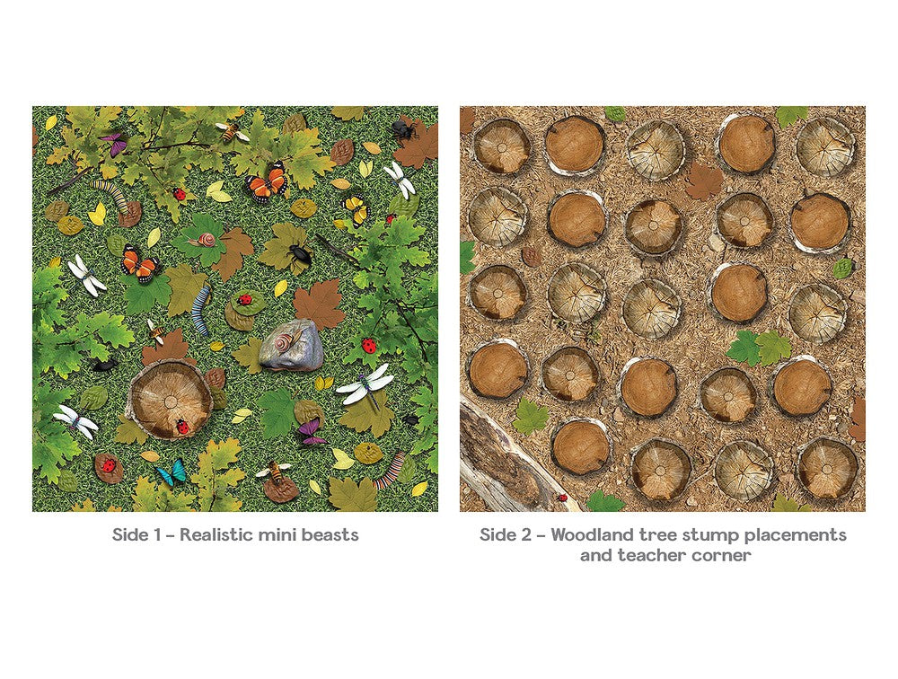 Double-Sided Design: Side 1 showcases tree stumps for placements or stepping stones, while Side 2 features a realistic minibeast print—a truly interchangeable and imaginative resource.