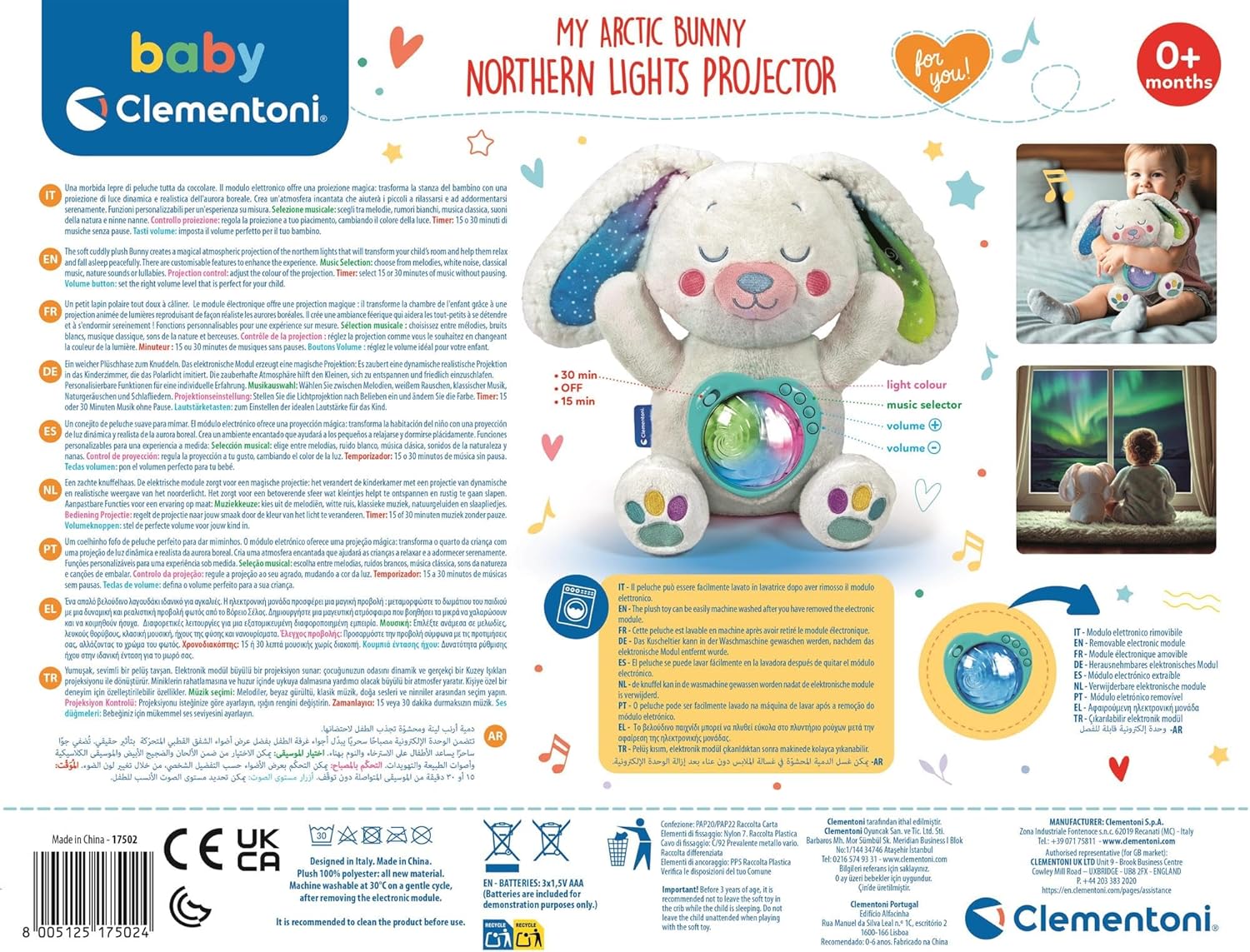 Create a calming bedtime ritual with the Northern Lights Arctic Bunny – a super-soft plush night light designed to soothe and comfort babies from birth. This cuddly companion projects a gentle Northern Lights-inspired light show in 10 calming colours, helping little ones drift off peacefully. With a blend of white noise and soft lullabies, it’s the perfect addition to any nursery or sensory sleep space. Thoughtfully designed with a removable electronic module, the plush is machine washable for everyday ease.