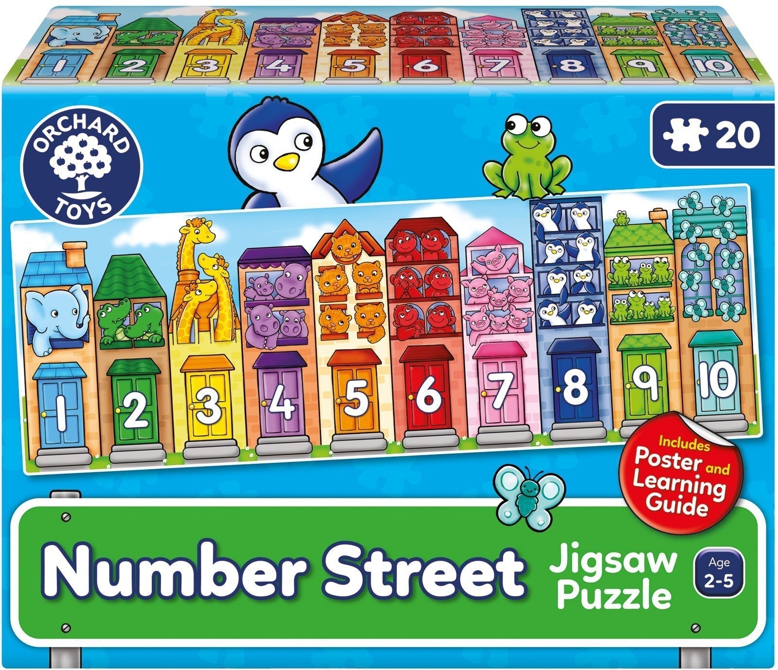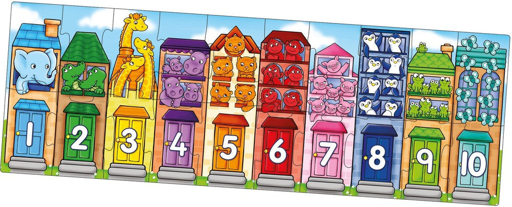 A fun and colourful introduction to counting. Piece together the numbered street from 1 to 10, then find the corresponding number of friendly animals for each house.This first puzzle is a great way to develop hand-eye coordination and problem-solving skills for young learners. Also includes a fun learning guide and a giant poster, perfect for any bedroom or playroom.