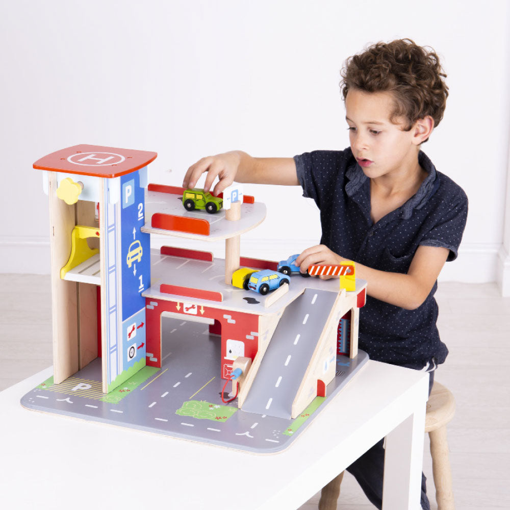 There's plenty of action on every level at the busy Park & Play Wooden Toy Garage, where a working lift hauls the cars up to the parking spaces. A service centre, car wash and petrol pump keeps things buzzing on the ground floor, while a down-ramp with lifting barrier provides vehicles with a swift exit when it's time for home.