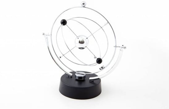 The sleek silver circlets of this beguiling desktop mobile rotate grandly around a central orb. The motion is continuous and, on first glance, seems impossible to comprehend. The secret is hiding at the base; a battery-powered engine spins a powerful magnet, creating a variable force that acts upon the pendulum weight secured to the outer hoop. Even when you know precisely how it operates, the perpetual, measured movement and gravity-defying form still captivate. Packed with retro geek-appeal, this is an excellent curiosity line of gifts for grown-ups.