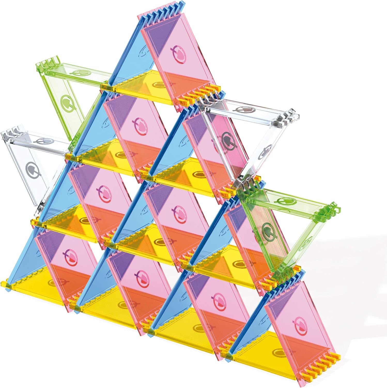 A modern twist on the classic "house of cards" game. Instead of traditional cards, this game features special coloured plastic tiles designed to fit together, allowing you to build captivating three-dimensional structures that defy gravity!
