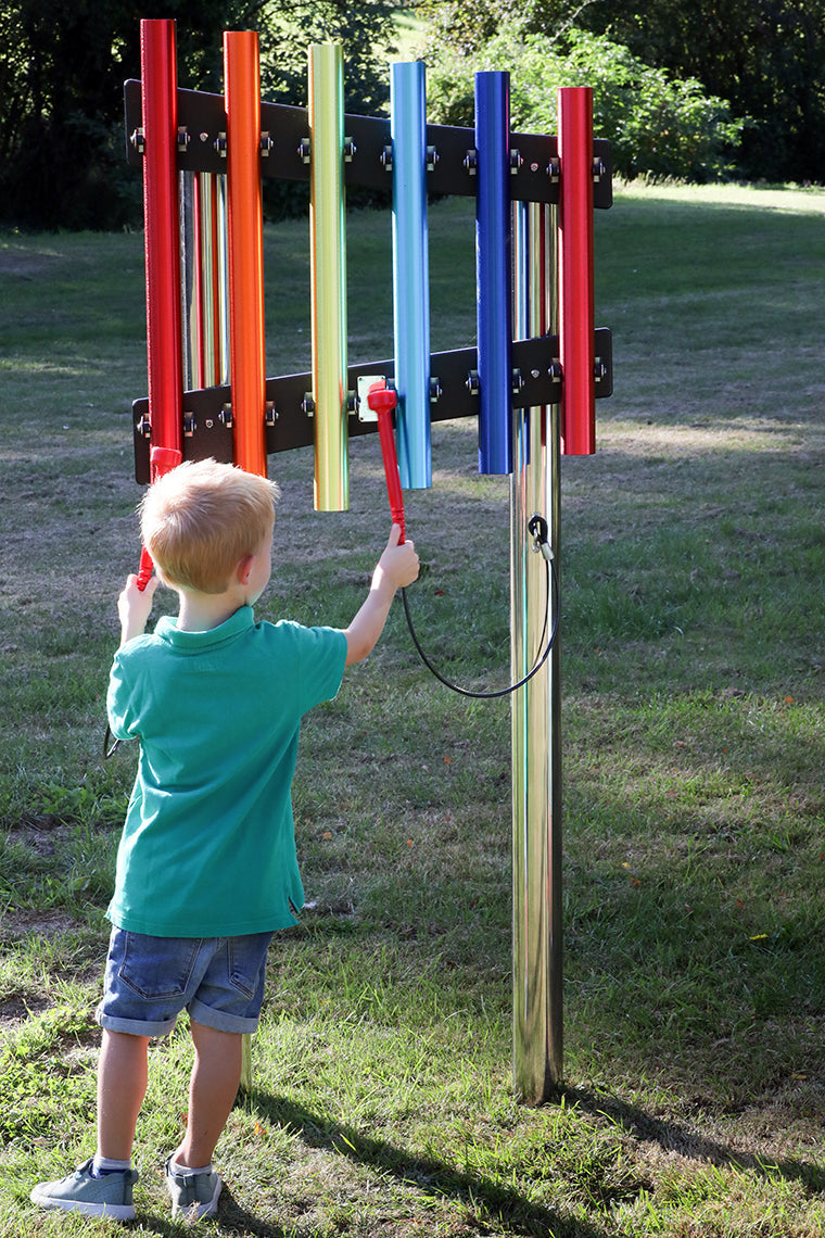 These chimes' size and vibrant colours make them especially suitable for smaller establishments like nursery schools, pre-schools, and kindergartens. They are easy to securely install in the ground, on a wall, fence, or post. You can even bring the outdoors in by mounting them on an indoor wall.