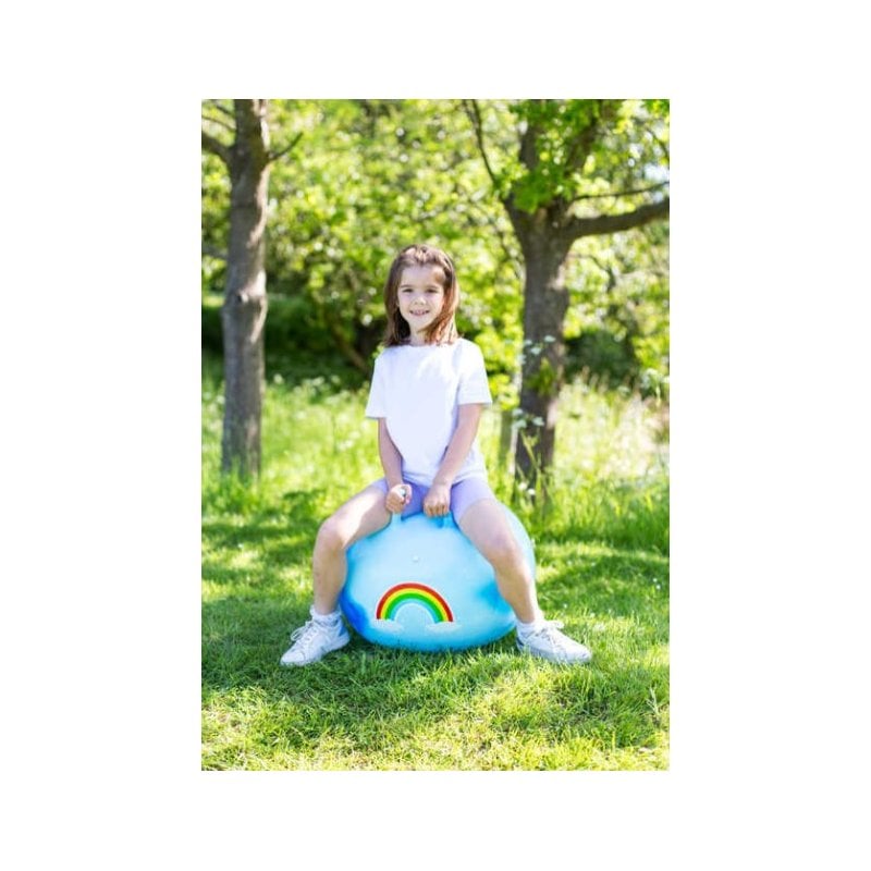 This 60cm bouncy ride-on toy has a sky blue design with cloudy details right across it and the front features a big and bright rainbow decal. It's a childhood classic that is still loved by adults and children alike.suitable ages 6+
