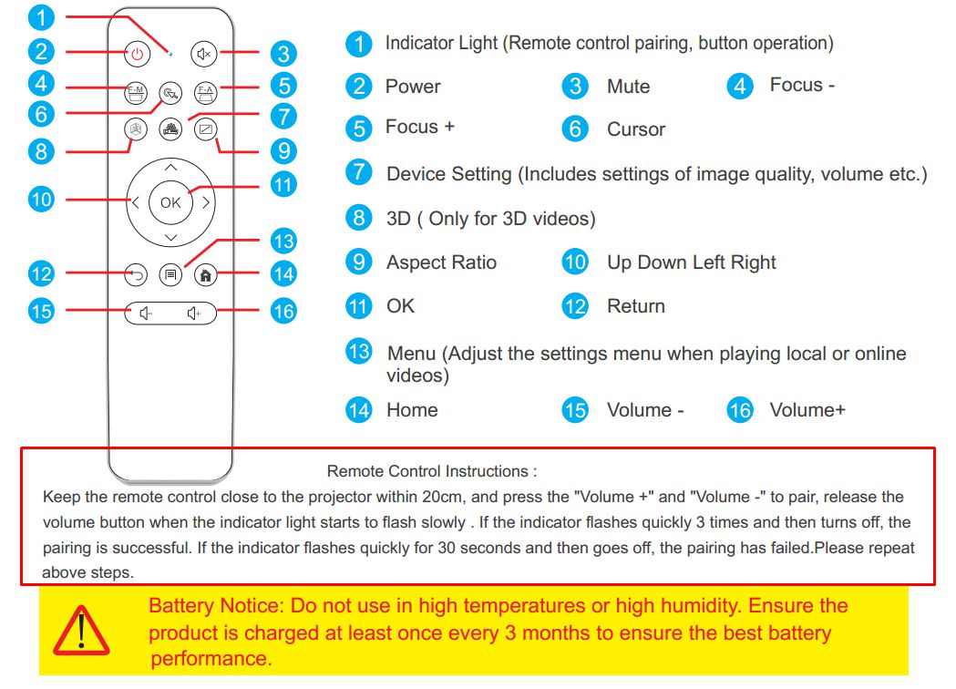 A replacement remote control for the Pico Genie M550 Plus 2.0The Remote Control allows you to control most functions of the projector, including file list navigation and video playback.