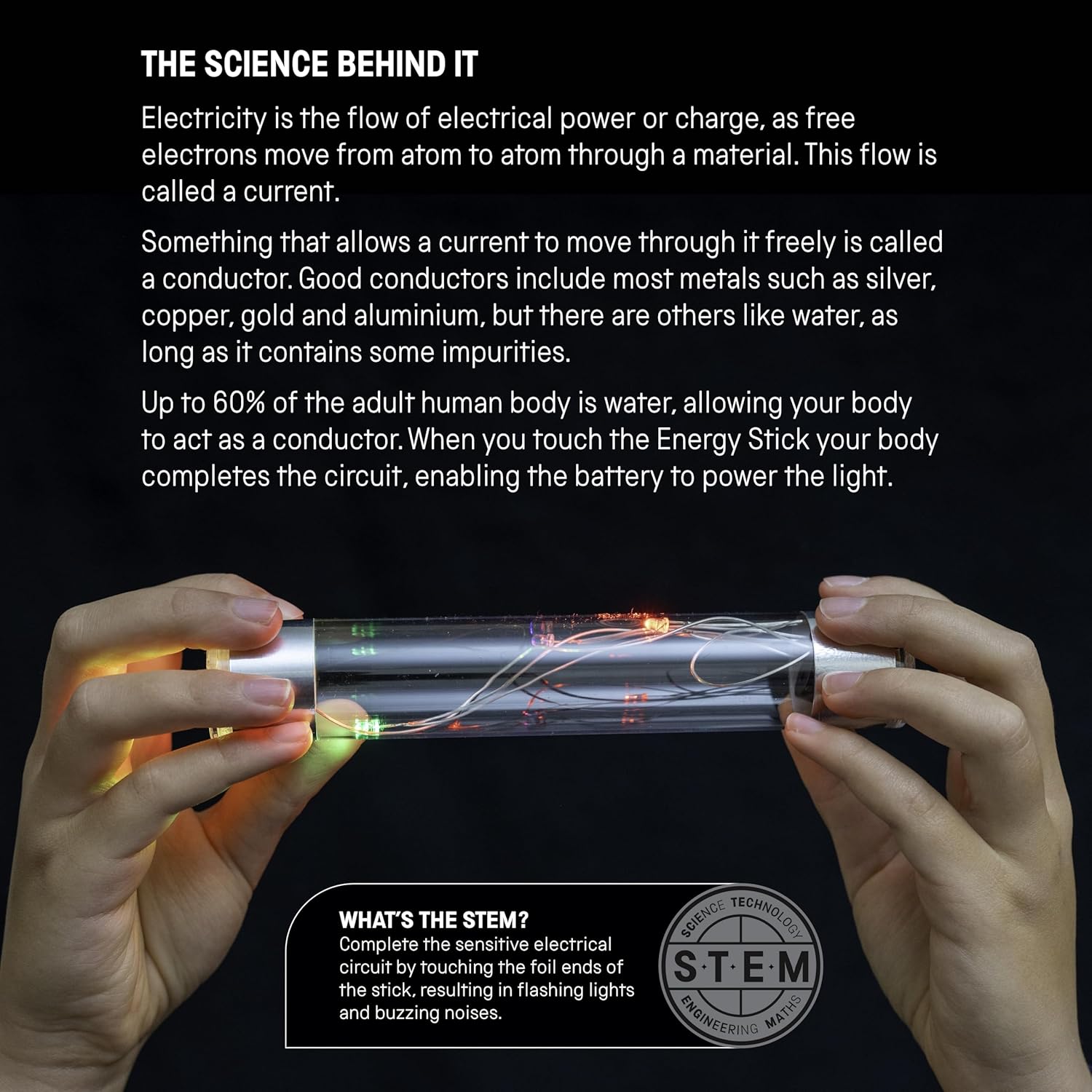 Discover the magic of electricity with the Science Museum Energy Stick – a hands-on learning tool that turns your body into a conductor! Simply touch the foil ends to complete the circuit and watch as the stick lights up and buzzes, giving instant feedback on how electricity flows.