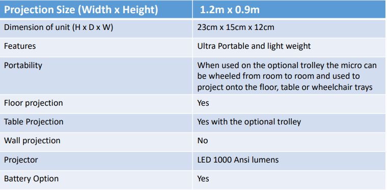 What would be the best size table to project onto? Do the images automatically project to the size of mat/table/tray being used? – the size of the table area is dependent on the height of the projector, you can resize the image if the table/wheelchair tray is smaller you can shrink the image down. Taking the projector higher up will increase the size of the projection but we do recommend with the micro that it be installed at around 1.2m high or if on the trolley you can play around with the heights to get the optimal size.