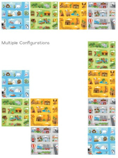 Versatile Sets: Choose from two sets, each comprising four road map carpets that vividly depict different environments. Set 1 includes urban squares and country-themed squares with details like electric car charging points and recycling bins. Set 2 features urban, desert, arctic, and tropical environments. Mix and match or use them individually for dynamic play.