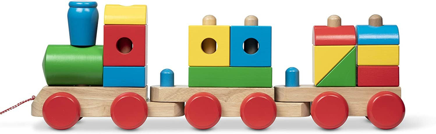 Contents: 1 wooden engine, 2 carriages, 15 colourful stacking blocks