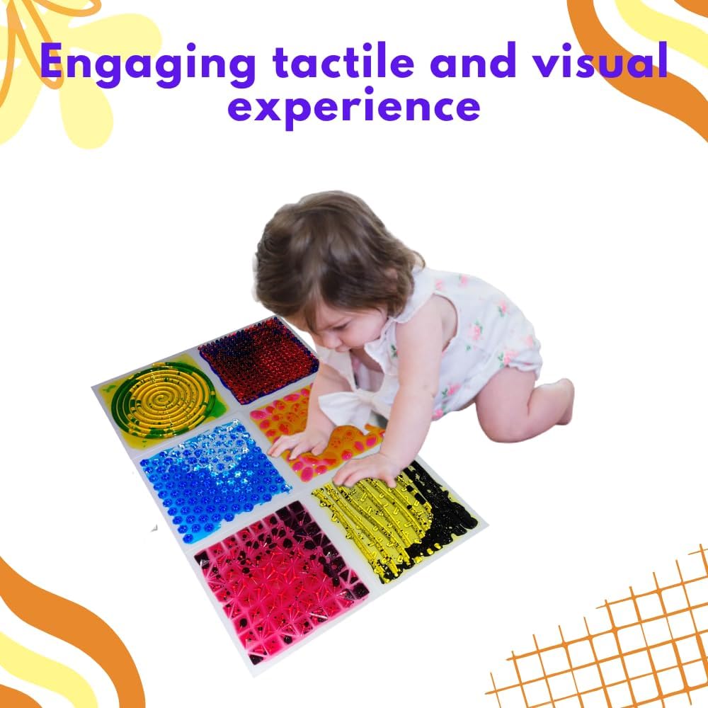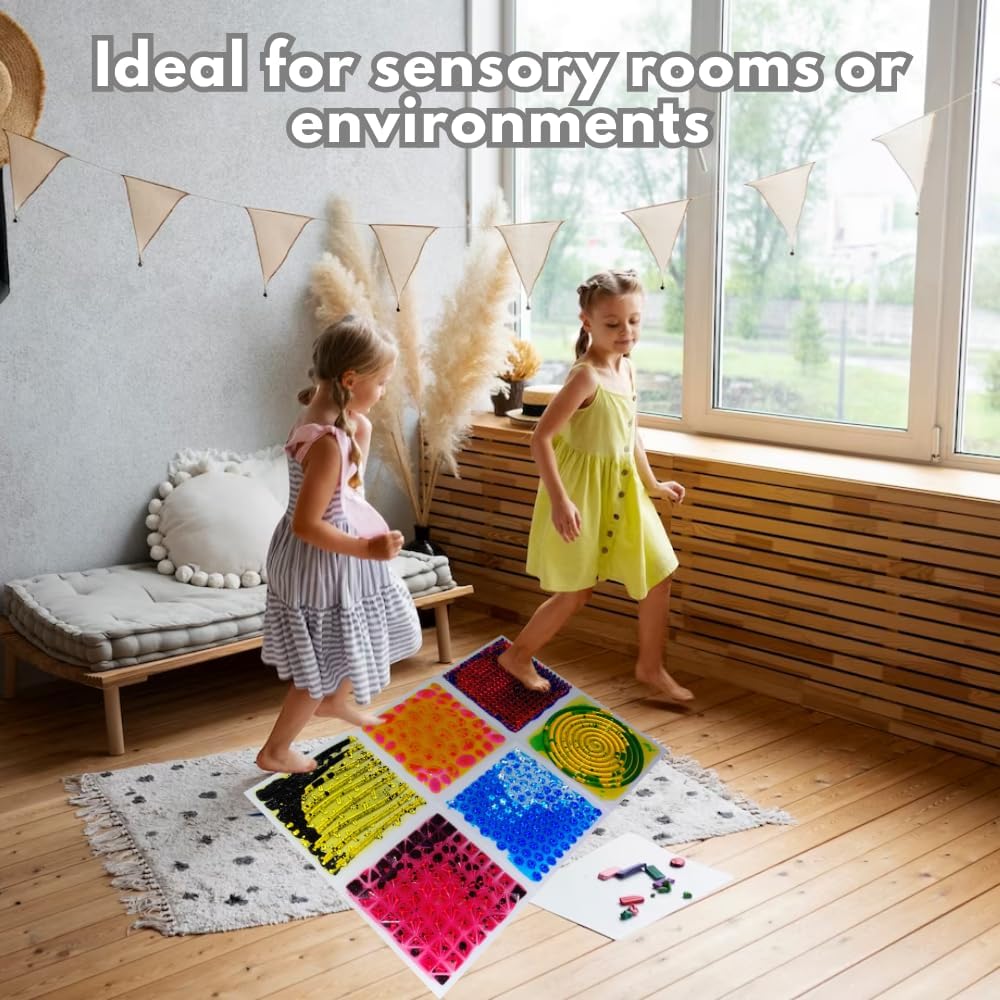 Textured Massage Liquid Sensory Tiles Set of 6, sized 30cm - the perfect addition to your sensory room or environment. These tiles are designed to provide an engaging tactile and visual experience, offering multi-sensory stimulation like no other. Here are some key features and benefits: