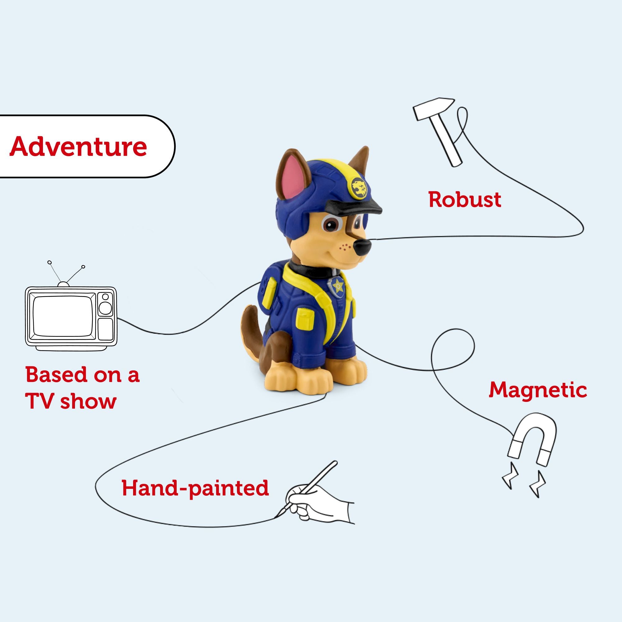 Chase is on the case! The PAW Patrol Jungle Pups Chase Audio Classic Tonie is packed with action-filled stories and jungle rescues. Little heroes can pop Chase onto their Toniebox and dive into thrilling adventures from Adventure Bay to the Hidden Jungle. Whether solving mysteries, rescuing animals, or saving the day, Chase and the PAW Patrol are always ready to roll!