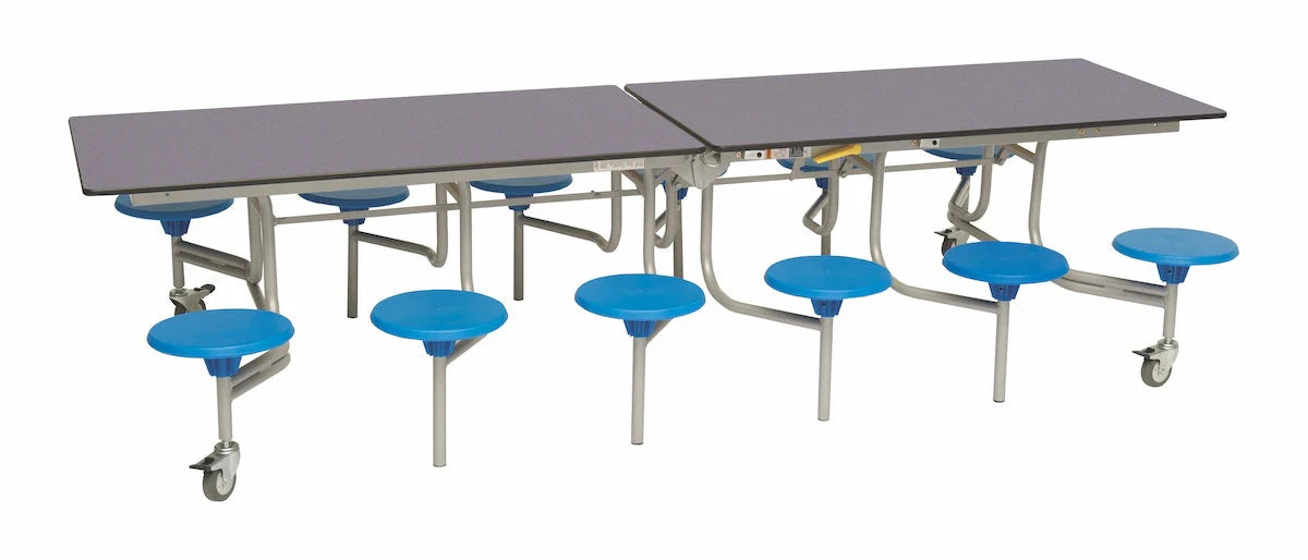 The Twelve Seat Rectangular Mobile Folding Table is a versatile, space-saving solution perfect for school canteens, event halls, or any dining space. Featuring a durable laminated table top with a water-resistant MDF core, this table is designed for everyday use. It easily folds for convenient storage and transportation, fitting through standard doorways. The heavy-duty locking castors and open position safety lock ensure maximum stability during use. With a range of customisable colours for the table top and stools, this mobile folding table is both functional and stylish.
