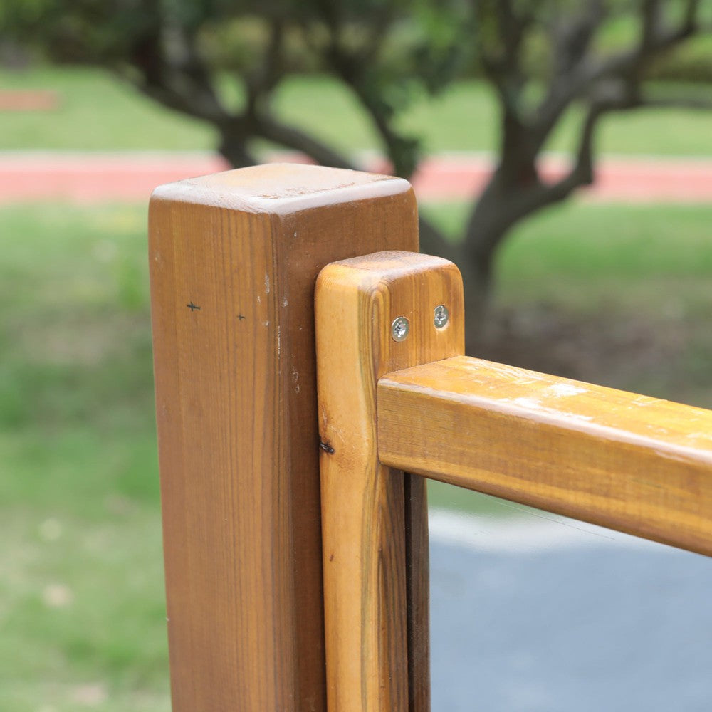 Pre-treated pinewood & PE. Units are free standing for mobility around the playground, but optional ground anchors (for soil/grass) are supplied for extra safety and for a permanent fixing.