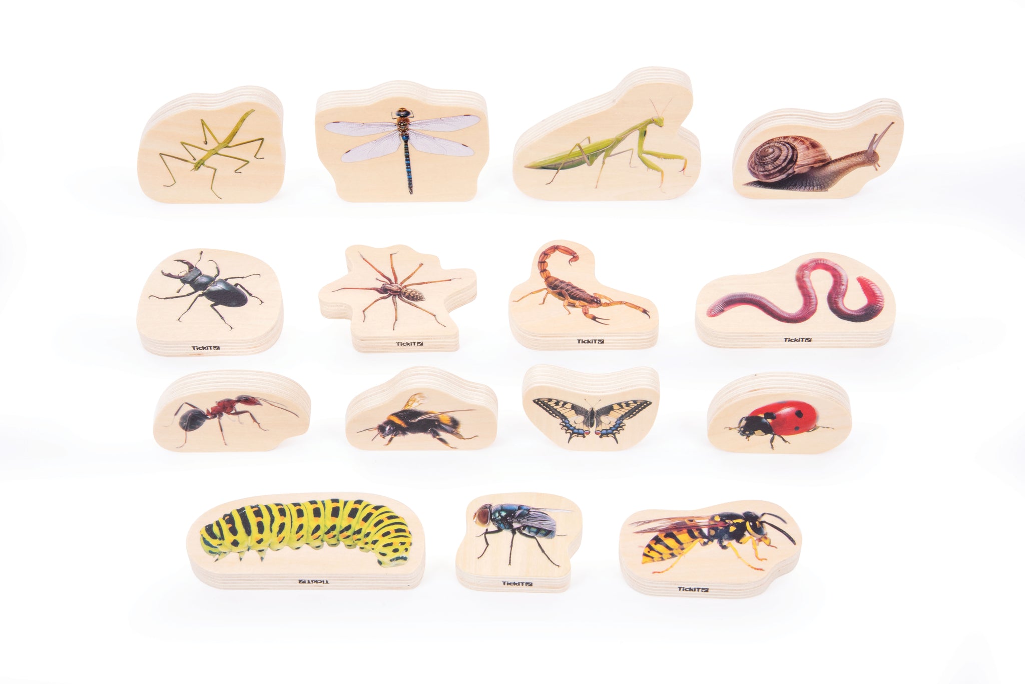 • Wooden Minibeast Blocks (Pack of 15)Double-sided picture blocks featuring minibeasts and woodland creatures.